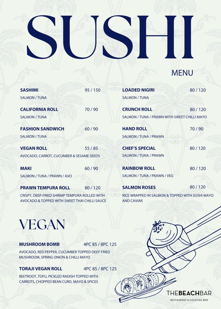 Explore the Beach Bar menu, offering a selection of thoughtfully prepared dishes and refreshing drinks designed for relaxed coastal dining. Whether you’re joining us for a light bite, a long lunch, or casual drinks, our menu is crafted to be enjoyed any time of day.